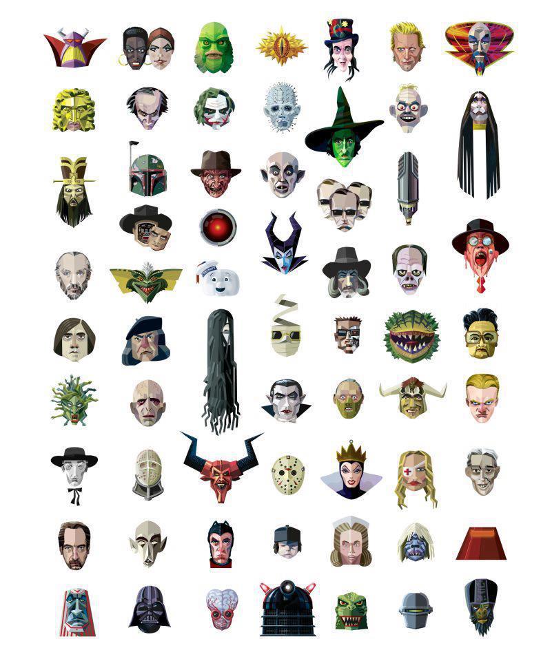 Discovered this yesterday on the Krueger Kollectables facebook page (give them a visit, won’t you?) and man, is it a blast! An assemblage of 65 movie villain headshots in one cool poster!